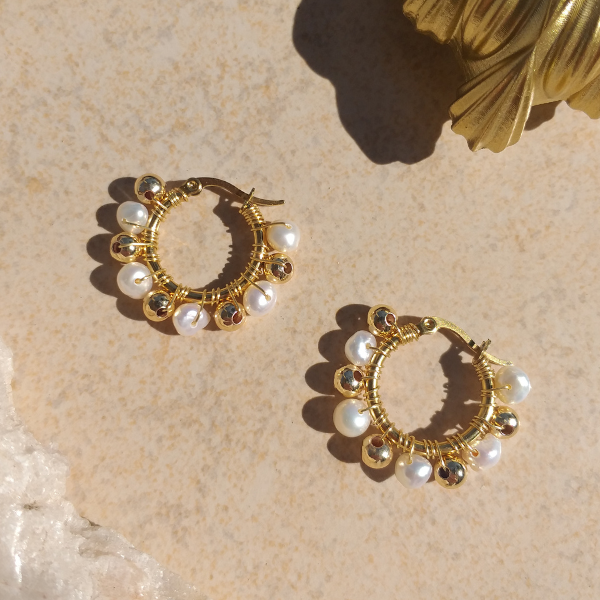 Bellas arracadas de perla de río y bolitas de chapa de oro.