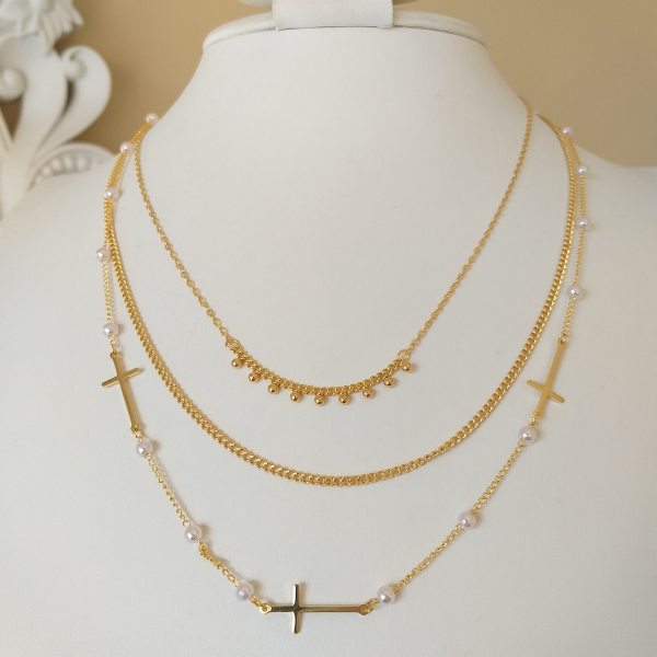 Este collar de triple cadena es una pieza única y elegante. Con cruces y perlas como detalles, le dará un toque de sofisticación a cualquier atuendo. Ideal para eventos formales o para agregar un toque de estilo a tu look diario.