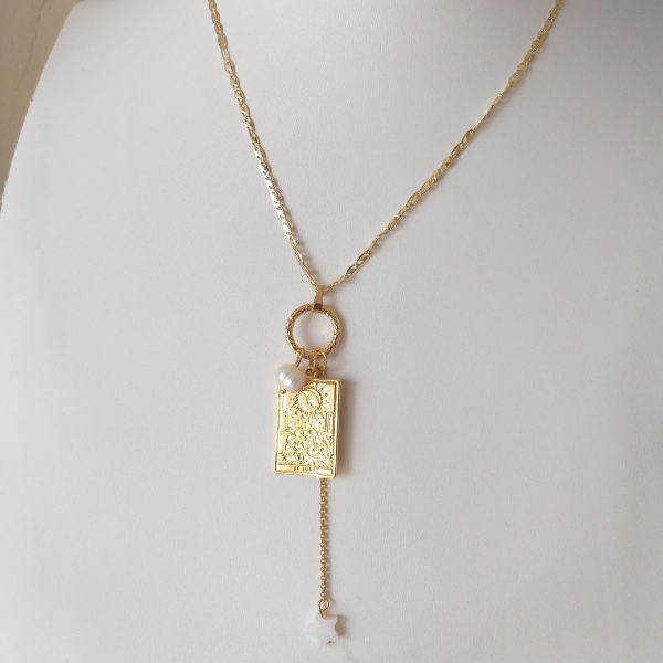🌙Esta collar con carta del tarot de la Luna en oro laminado debe tener su lugar en tu colección. Esta joya, delicada y destellante, invoca la magia de la noche y la energÃa lunar para ofrecerte luz y esperanza durante los tiempos más oscuros. Sus hermosos matices de oro se deslizan a lo largo de la carta del tarot de la Luna para tejer una historia fascinante de sabidurÃa y profecÃa.