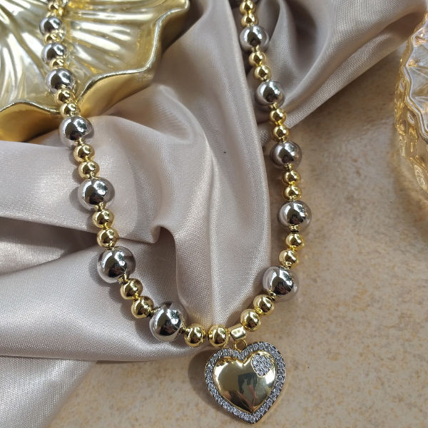 Tendencia! Este collar cuenta con un diseño único de dos colores y un dije en forma de corazón. Hecho en oro laminado, este collar es elegante, perfecto para cualquier ocasión.