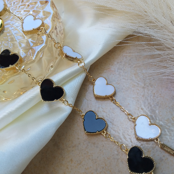 Llena tu estilo con nuestra exquisita pulsera de corazones. Disponible en elegante negro o en suave blanco, esta pieza única te hará destacar.