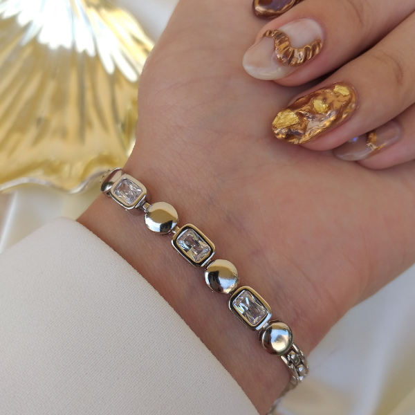 Esta pulsera está hecha en rodio y cuenta con zirconias, lo que le brinda un acabado brillante y duradero. La pulsera es ideal para agregar un toque de elegancia y estilo a cualquier atuendo, perfecta para cualquier ocasión. Con su diseño clásico y materiales de alta calidad, esta pulsera es una adición imprescindible a cualquier joyero.