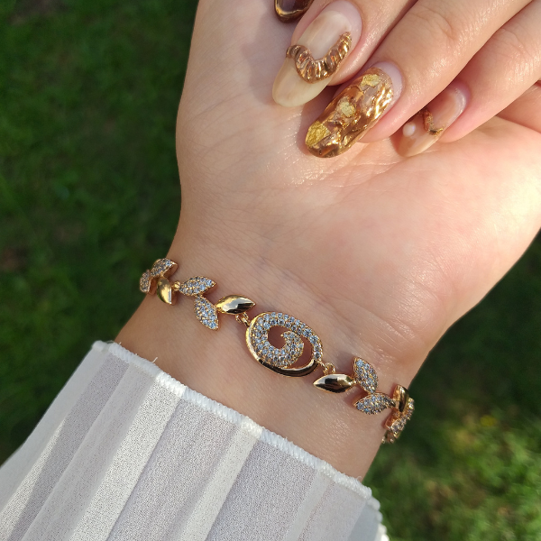 Esta pulsera elegante está hecha de chapa de oro de alta calidad, lo que le da un acabado brillante y duradero. Se adapta a cualquier ocasión y complementa cualquier atuendo, agregando un toque de elegancia a tu estilo.