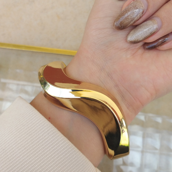 Deja que las olas de elegancia envuelvan tu muñeca con este brazalete rígido dorado que captura el movimiento del mar en cada curva.