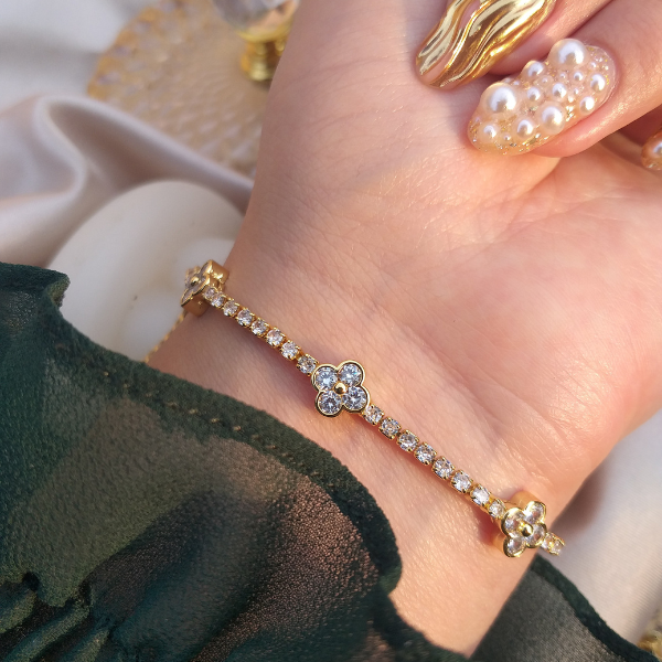 Pulsera elegante elaborada en oro laminado que combina delicadas flores con brillantes zirconias.