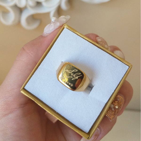 Expresa tu amor propio con nuestro anillo Self Love en talla 7. Su diseño elegante y la frase grabada te recordará la importancia de amarte a ti misma todos los días. Una joya que te hará sentir exclusiva y confiada.