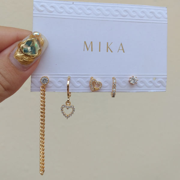 Este set de 5 aretes en oro laminado presenta una variedad de diseños únicos para complementar cualquier atuendo. Con una mezcla de formas y tamaños, estos aretes son versátiles y elegantes.